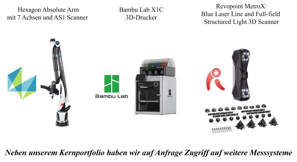 Wir arbeiten mit hochmodernen Geräten wie dem Hexagon Absolute Arm (7 Achsen) inkl. AS1-Scanner, dem Revopoint MetroX 3D-Scanner sowie dem Bambu Lab X1C 3D-Drucker. Unsere Auswertungen erfolgen u. a. mit PolyWorks – für maximale Messgenauigkeit und aussagekräftige Ergebnisse.